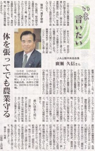 昨日のしんぶん赤旗に山梨県のJA廣瀬会長が登場。山梨県は東京にいた若い頃、バイクのツーリングで、ぶどう畑やリンゴ畑の横を走った思い出があります。 廣瀬会長は言います。「TPPは体を張ってでも反対していく」。強固な意志を感じます。「食料は輸入…