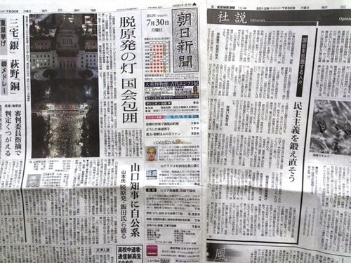 非常に良いことです。「朝日」が昨日の原発なくせ国会包囲デモを、1面トップで、いい写真つきで載せました。 日頃、批判ばかりしている私としても、今日の「朝日」は、素直にですね、良かったと思います。この調子で主権者の立場で、今後もお願いします。 …