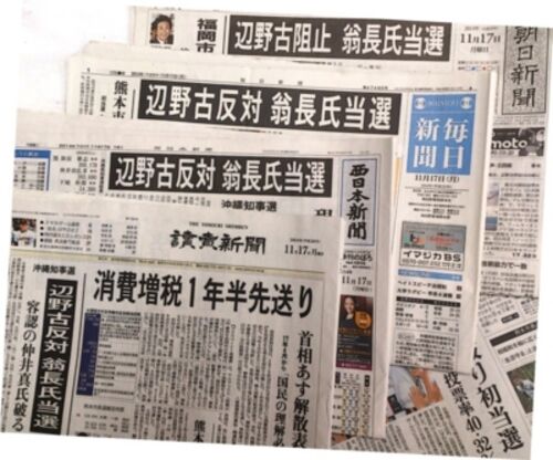 昨日の各紙の1面です。 当然、沖縄知事選の結果がトップのはずですが、「読売」だけは、安倍首相の「消費税増税1年半先送り」の大見出しでした。 知事選結果は左端に。 「読売」らしい。 さて、7時ごろ、安倍総理が解散を表明した。 動機が不純ですね。 …