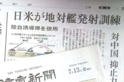 昨日の「読売」です。 自衛隊が米軍を共同して、地対艦ミサイルの発射訓練をした事が書いある。 陸自の「12式地対艦誘導弾」をハワイに運んで、海自のP3Cと米軍の無人偵察機が目標の位置情報を共有し、4発を発射して90キロ離れた米軍の退役艦に発射…