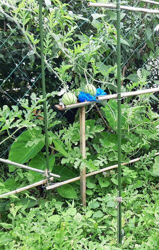 スイカ。実がついてうれしいかぎりですが、 高いところに実をつけたので、大きくなったら落ちると思い、どうするか思案…。 で、台を設置。 . こちらはコンテナを設置。