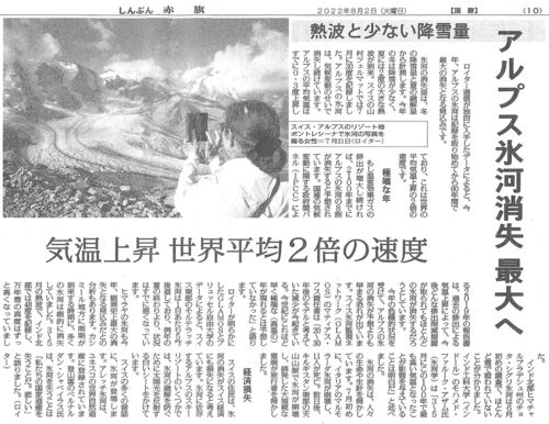 「赤旗」8/2です。 アルプスの氷河は、このところの熱波と冬の降雪量が少なさが重なって、融解、縮小が急速に進んでいます。 現状では、2100年までにアスプス氷河の8割がなくなると言われているそうで、これからどんな温室高ガス排出の削減を行っても、既に…