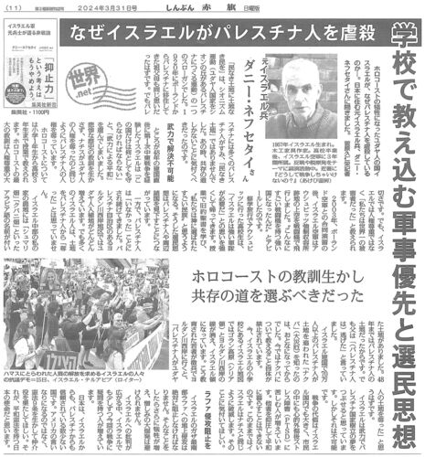 3/31の「赤旗」日曜版です。 イスラエルのガザ虐殺がなぜ止まらないのか? 全体としてイスラエル国民が支持が根底にあるが、それはなぜ? 元イスラエル兵のダニー・ネセタイさんがインタビューに答えている。 イスラエルでは、ホロコーストについて小学1年…