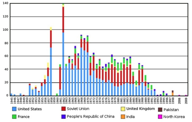 1945〜2009年の各国の核実験 (ウィキペディアより)