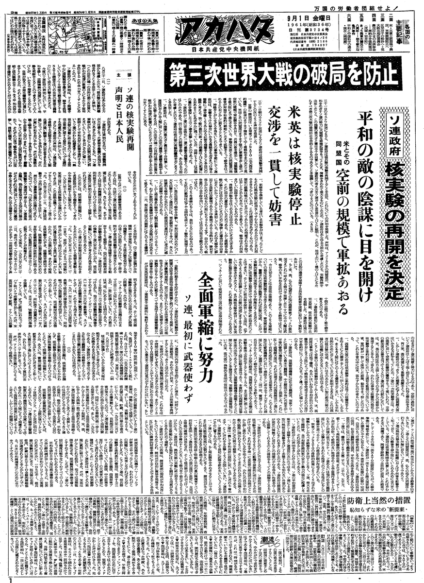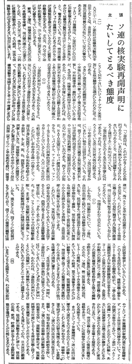 ソ連の核実験再開表明の報道。数年前、この「アカハタ」(1961年9月2日付)の記事を見た時はショックだった。