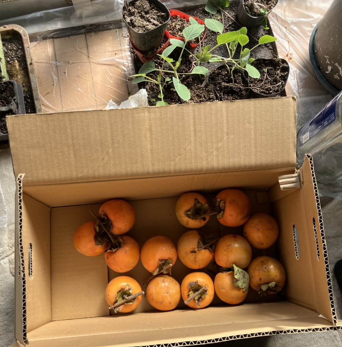 2025-11-16 吊るし柿 季節と自然 近くの知り合いからもらった渋柿です。 娘らにやったり、東町のメンバーにもらってもらったり。 残りを吊るし柿に。 天気も良かったので、皮むいて、熱湯につけて、ヒモをつけて、吊り下げて、