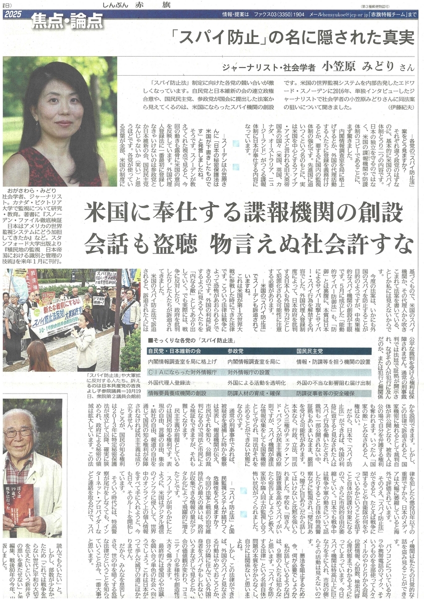 ジャーナリストの小笠原みどりさんがNSAのシステムエンジニアだったスノーデンがスパイ活動を暴露した事件がありました。